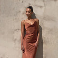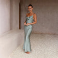 - Design: Elegant cowl neck with spaghetti straps and slim fit.