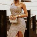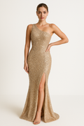 Dress for women – One-shoulder evening dress – Slim fit – Sequins – Slit. Sparkling one-shoulder dress with slim fit and elegant slit. Perfect for evening events. Accentuate your figure with sequins and a sophisticated cut. Create an unforgettable look for festive occasions with this beautiful dress.