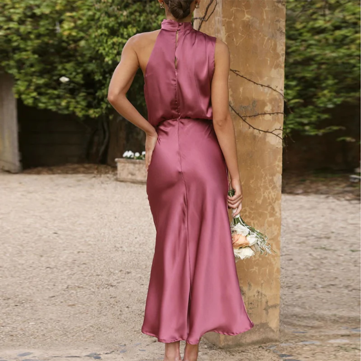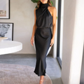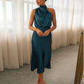 Elegant Evening Dress with Halterneck and Fitted Waist. This beautiful satin-look dress is perfect for festive occasions. The dress features a flattering fitted waist and a sophisticated halterneck design. Get ready to impress with this elegant party dress!
