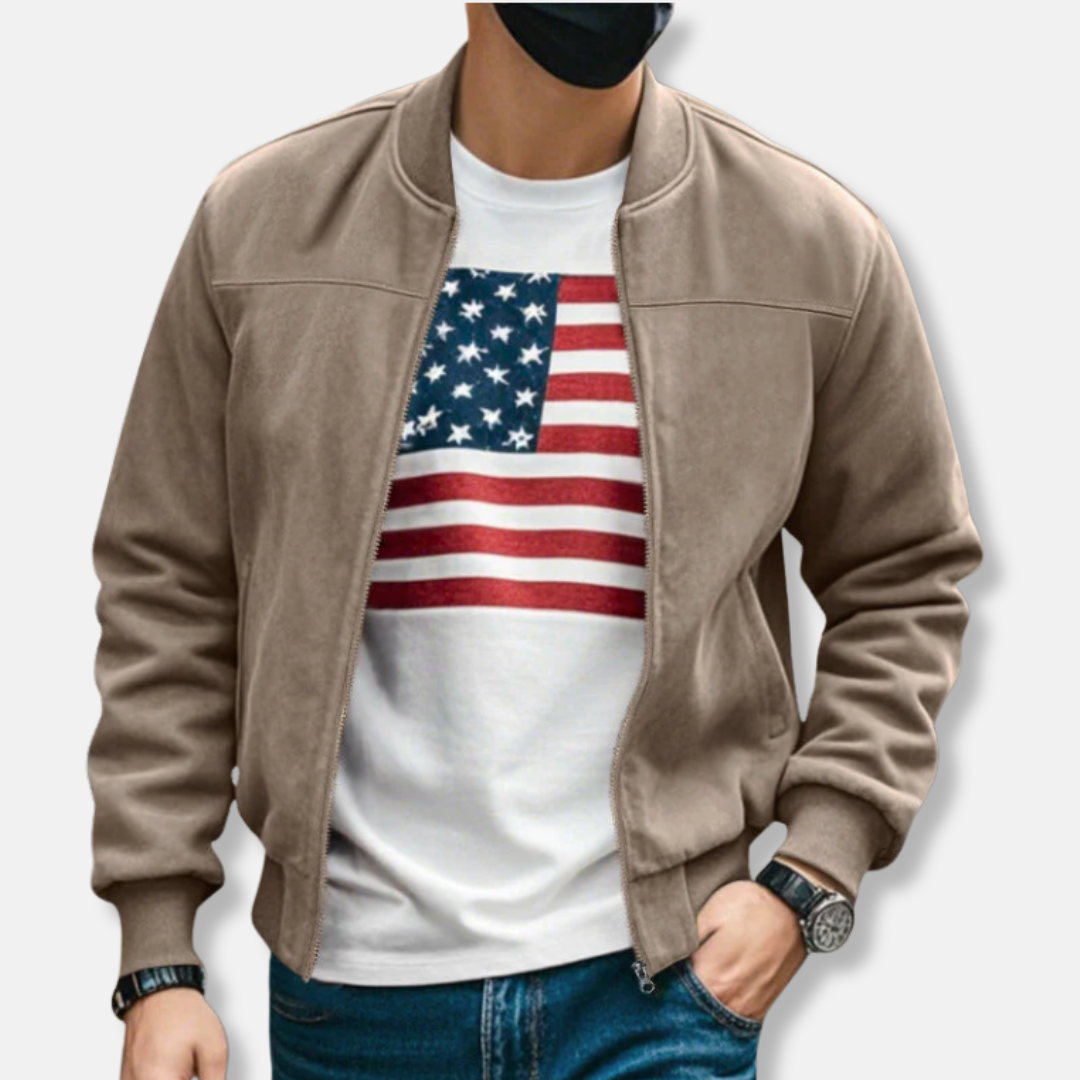 Elevate your casual wardrobe with our Men’s Bomber Jacket. Crafted from a refined brushed fabric with a soft, suede-like texture, this piece features a classic ribbed collar, cuffs, and a sleek zip front. Its regular fit offers a flattering silhouette, ensuring versatile styling for the discerning gentleman.