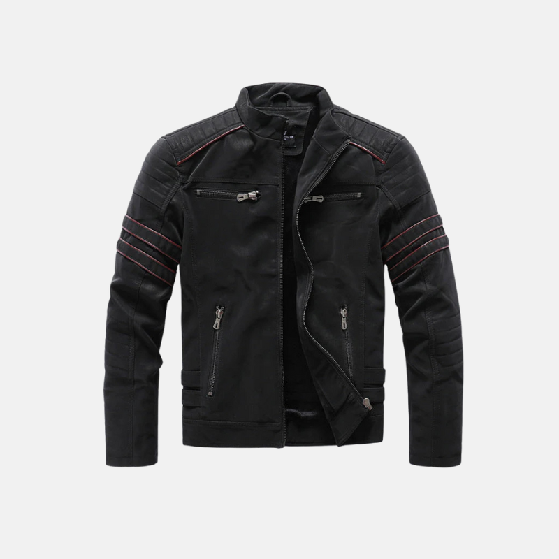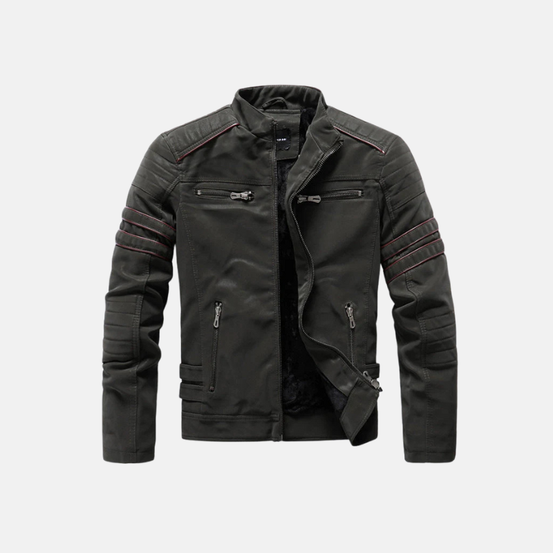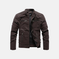 Elevate your casual wardrobe with our Men’s Faux Leather Jacket. This slim-fit, hip-length design features a sophisticated stand collar and distinctive ribbed panels, offering a tailored silhouette that exudes timeless style and effortless versatility for the discerning gentleman.