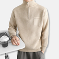 Elevate his casual wardrobe with this refined Men’s Cotton Blend Quarter-Zip Sweatshirt. Its relaxed fit and stand-up collar offer a flattering silhouette, ensuring timeless style and versatile comfort for the discerning gentleman.