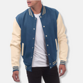 Men’s Varsity Jacket – Wool Blend Body – Faux Leather Sleeves – Relaxed Fit – Snap Front by Nordisk-Flair. This stylish varsity jacket offers a classic look with a comfortable, relaxed fit. Features a wool blend body and faux leather sleeves. Perfect for adding a touch of retro cool to any outfit.