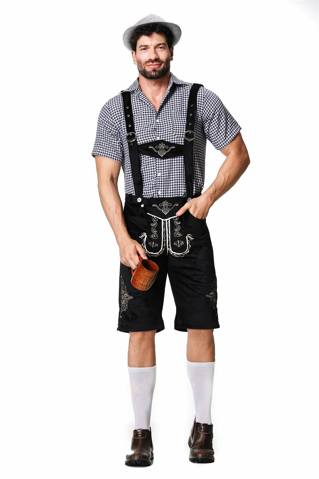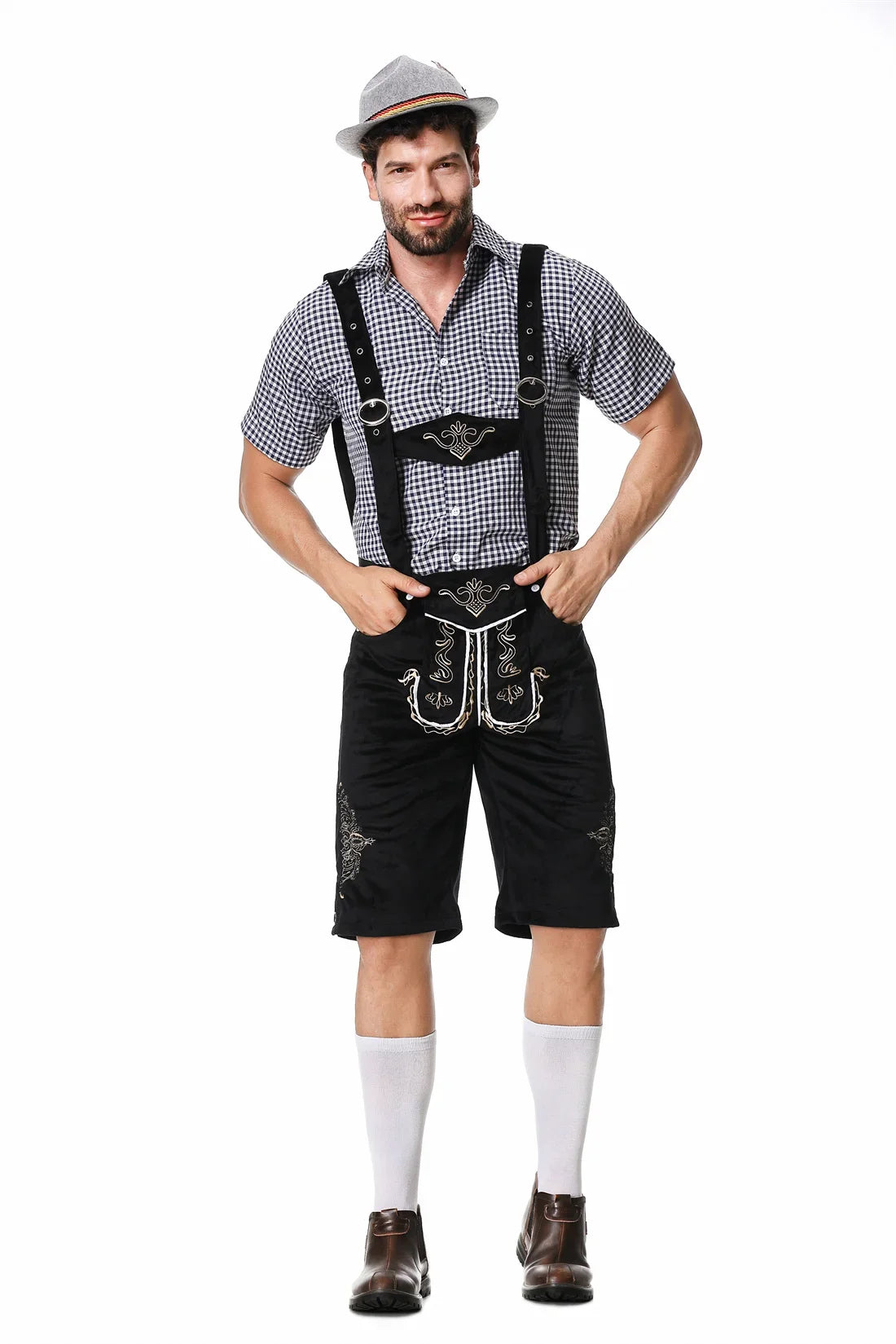 Complete the classic Bavarian look with a checkered shirt and hiking boots, or add a modern twist with a solid-colored tee and casual shoes.