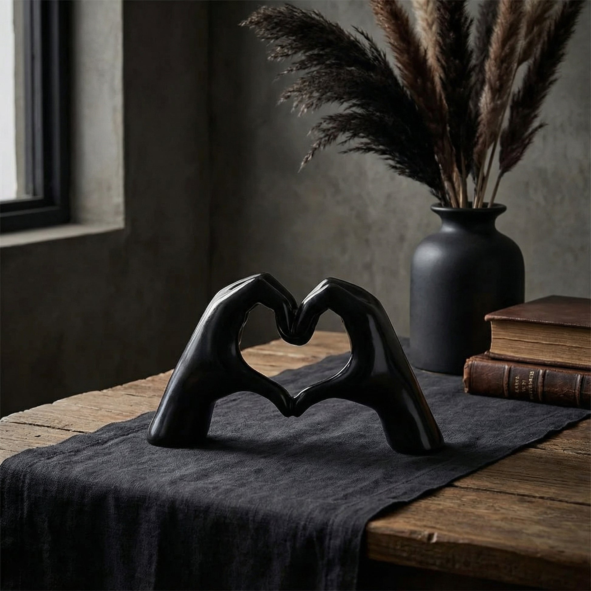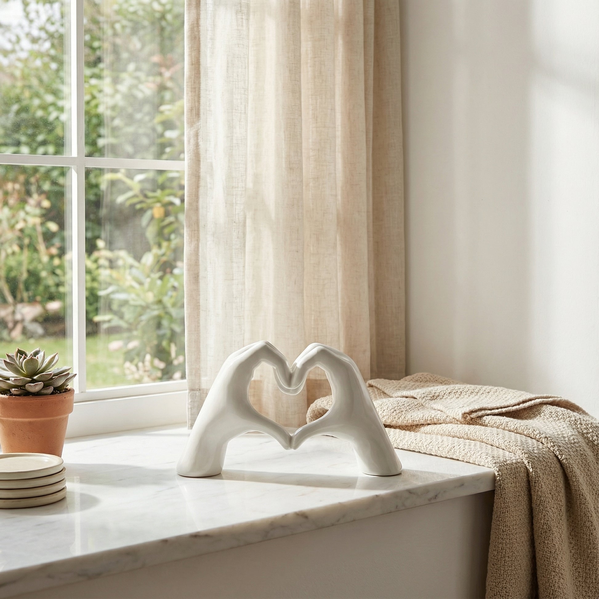 Elevate your space with the Sculptural Resin Hand-Heart Tabletop Sculpture, a modern and romantic accent piece. Crafted from high-quality resin, its clean, sculptural lines and smooth finishes embody elegant, understated design. This piece features a unique hand gesture forming a heart-shaped negative space, making it a thoughtful addition to any contemporary interior.
