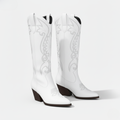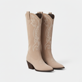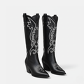- Design: Knee-high, Western-style with intricate embroidery and a stacked block heel.