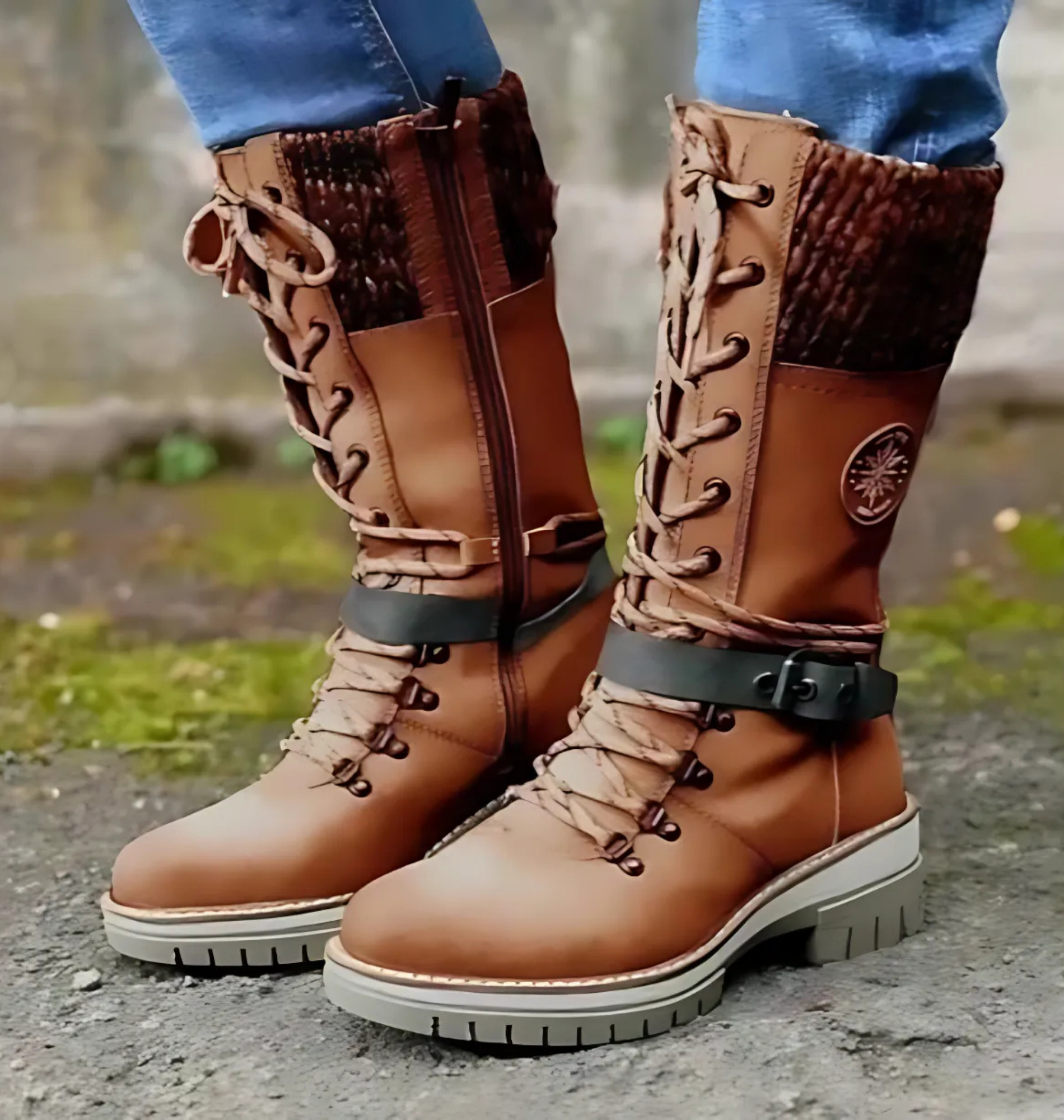 - Design: Mid-calf, relaxed fit with a full lace-up front.