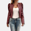 Elevate your wardrobe with our Women’s Faux Leather Cropped Jacket. Featuring a sophisticated collarless open front and voluminous puff sleeves, this piece offers a tailored, flattering silhouette. Perfect for adding a touch of timeless elegance and versatile style to any ensemble.
