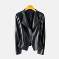 Elevate her wardrobe with our Women’s Cropped Faux Leather Jacket. Featuring a sophisticated stand collar and an edgy asymmetrical zipper, this piece offers a tailored fit that beautifully defines the silhouette, ensuring timeless style and versatile elegance for any discerning woman.