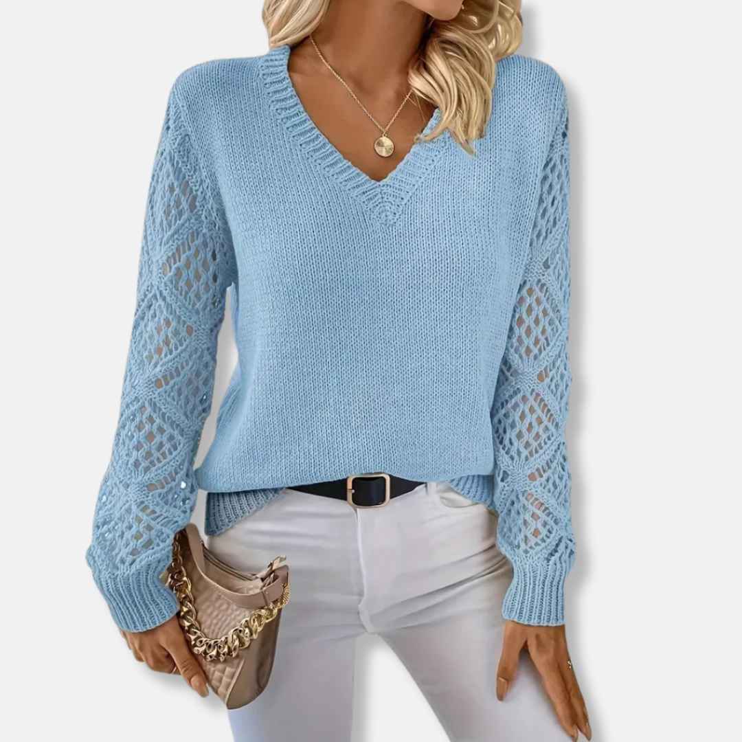 - Design: Relaxed fit with elegant open-knit patterned sleeves.