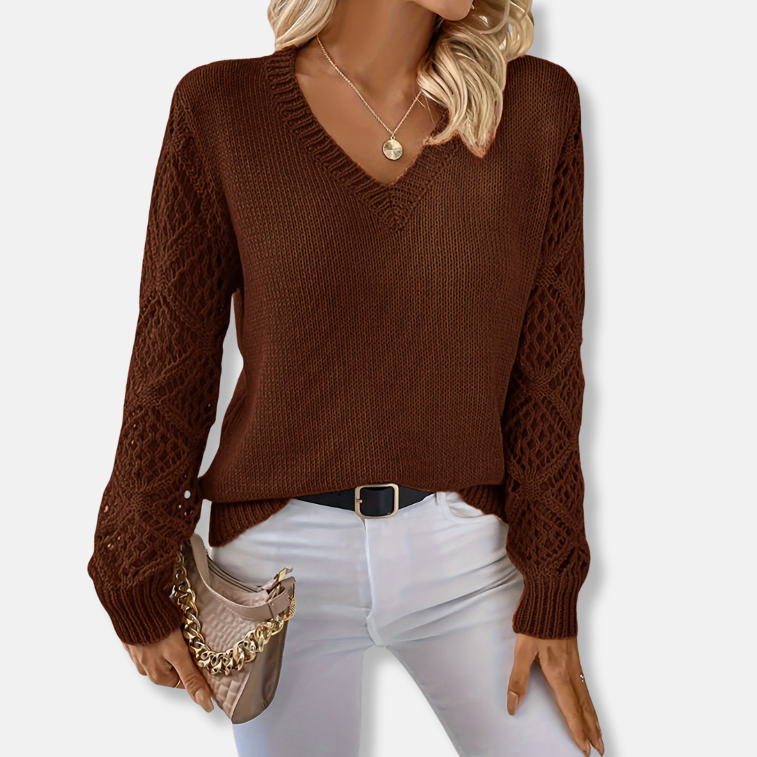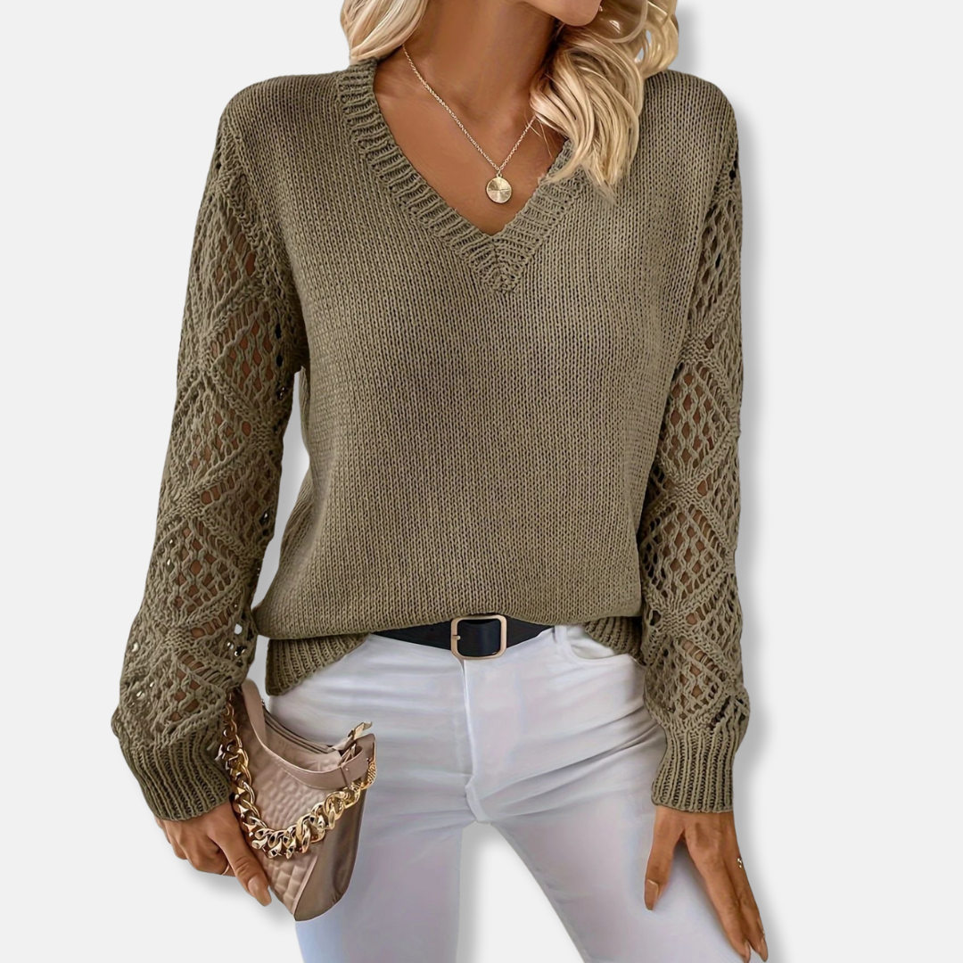 Embrace effortless elegance with our Women’s Knit V-Neck Sweater. Designed for a relaxed fit, this long-sleeve piece features distinctive open-knit sleeves, offering a sophisticated semi-sheer effect that flatters and adds a touch of modern charm to your ensemble.