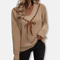 Elevate your everyday with our Women’s Knit V-Neck Sweater. Designed for a relaxed fit, this timeless piece features a charming ribbon tie at the V-neckline and refined ribbed cuffs, offering both comfort and sophisticated style for the discerning woman.