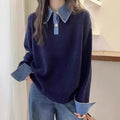 This women’s sweater brings effortless style with its oversized fit and cozy wool knit, perfect for staying warm in chilly weather. The denim collar and cuffs add a chic layered touch, giving it a unique and trendy twist. Ideal for casual days or smart-casual outings, it’s a statement piece that blends comfort and style beautifully.