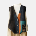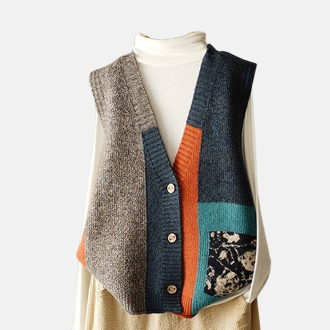 Elevate your everyday with our Women’s Knit Blend Vest. This loose-fit, V-neck, button-front piece features a sophisticated patchwork design, offering a relaxed silhouette and versatile styling for the discerning woman who values timeless elegance.