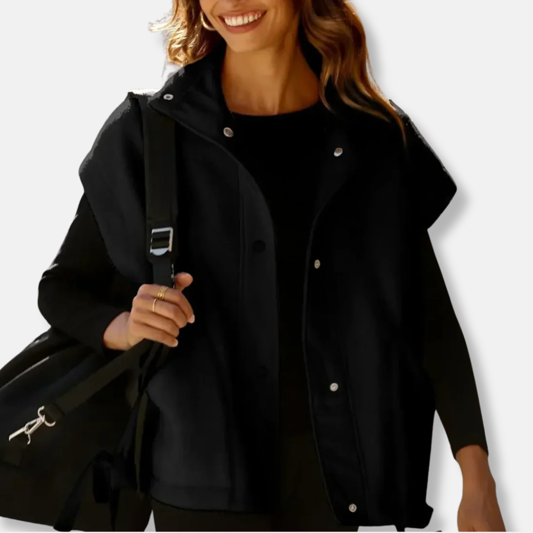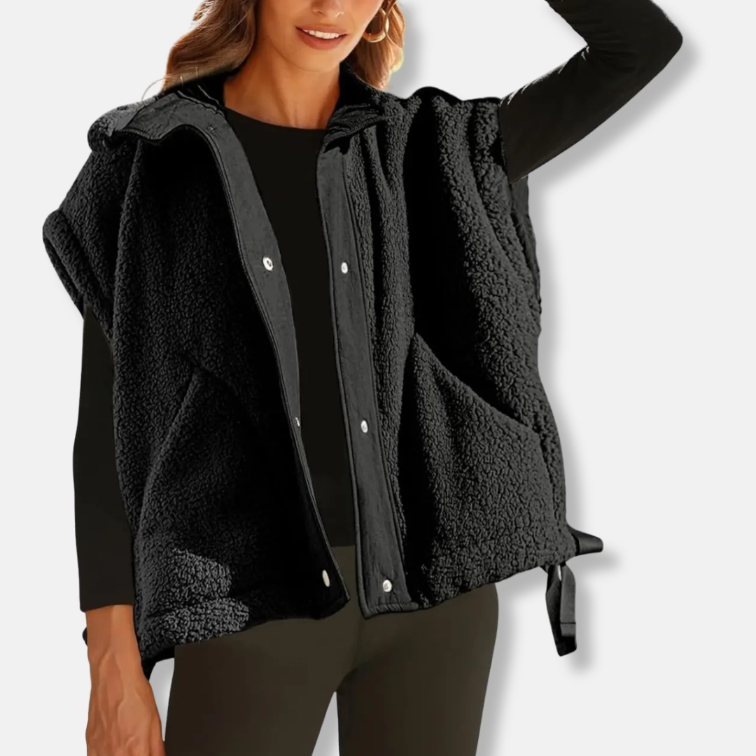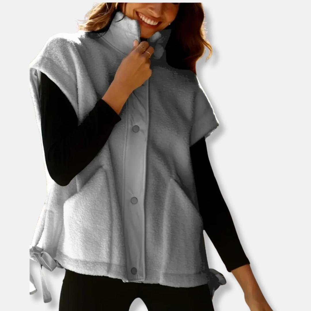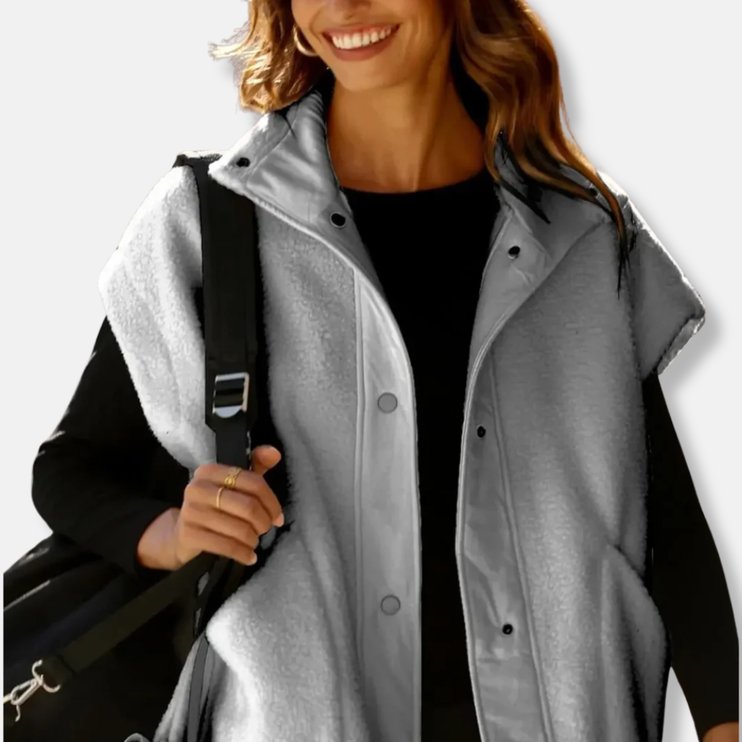 Elevate your everyday with our Women’s Vest, a plush fleece knit designed for an oversized, relaxed fit. Featuring a sophisticated stand-up collar and convenient snap button closure, this piece offers timeless style and effortless comfort, perfect for layering with a flattering silhouette.