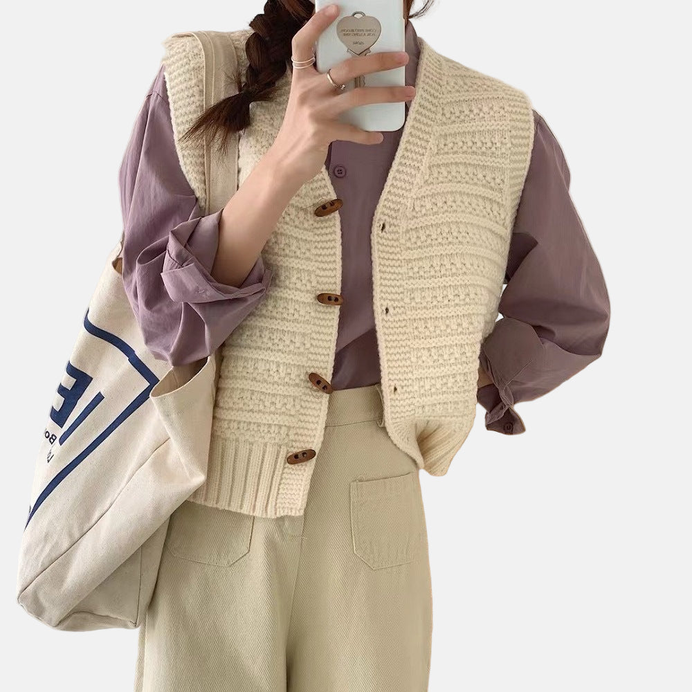 Bring a touch of cozy elegance to your outfit with this knitted button front vest. Crafted with a textured pattern and a flattering V-neckline, it adds both warmth and style without the bulk of a full sweater. The wooden button details create a charming, rustic touch, making it perfect for layering over shirts, blouses, or dresses. Ideal for casual outings or cozy indoor looks, this vest is a must-have for chilly days.